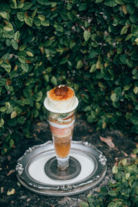 一口目は、りんごのキャラメリゼがほろ苦く香ばしいアクセント。そこにグラニースミスの酸味が重なり、味覚がきゅっと引き締まります。次に口にするのは、やさしい甘みのシブストクリーム。その上品なコクが酸味をやわらげ、全体をひとつのハーモニーへと導いてくれます。食べ進めるごとに、グラスの底からはコンポートやジュレが現れ、りんごが持つ多層的な魅力が次々と開かれていくのです。